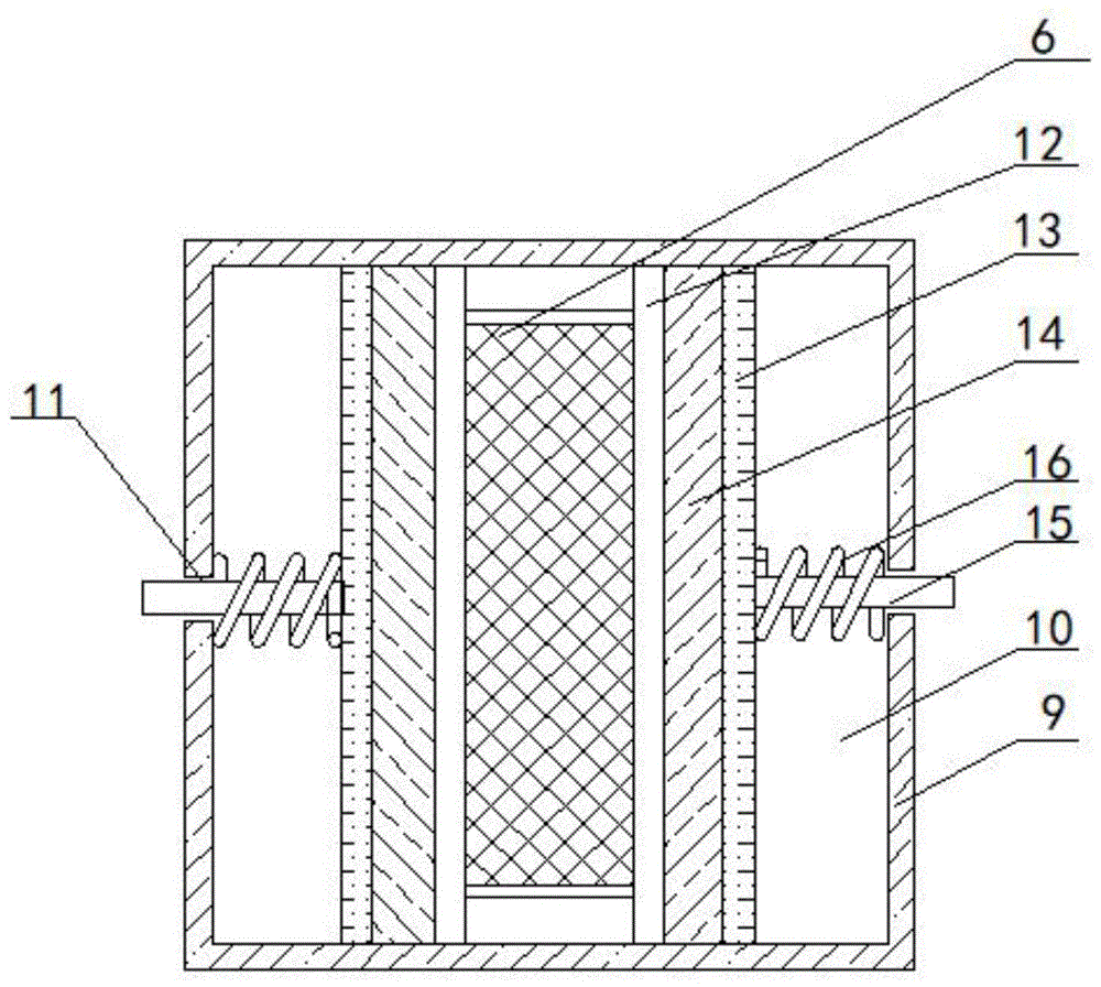 工作原理:當盲板6在轉軸一4的帶動下左右滑動位移時,彈簧16的彈力將彈性水管13向盲板6的兩側推,彈性水管13移動帶動兩個海綿抹布14向盲板6的兩側靠近,直到最后完全壓住盲板6的兩個側面,此時由于彈簧16的彈力作用,彈性水管13中的清潔液被擠壓后由海綿抹布14吸收,兩個海綿抹布14會分別對盲板6兩個側表面進行擦拭清潔,清潔后的污水順著水槽12流走,在清潔箱體9向盲板6處移動過程中,在彈性水管13兩端與清潔箱體9接觸處清潔箱體9表面開設凹槽17,并且凹槽17的底部有凸出部分,可以防止滑塊18脫離凹槽17,通過在凹槽17的頂部和底部之間安裝連接桿19,并在連接桿19的中部安裝滑輪20,可以將滑塊18與凹槽17內(nèi)壁之間的硬摩擦轉變?yōu)榛瑒幽Σ粒?/span>